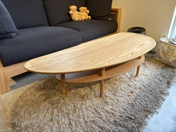 上下2段の天板のそれぞれ違うそりあがりと様々な天板の形状を選べる個性があふれるリビングテーブル。