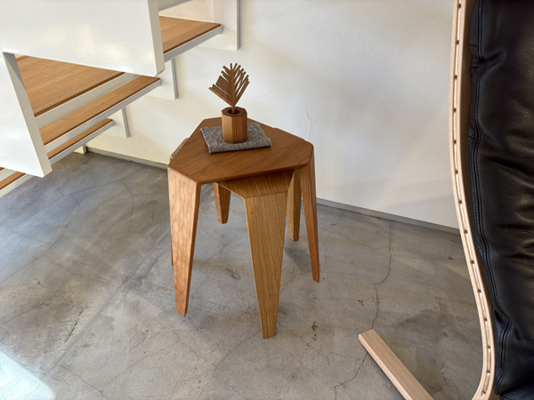 折り紙を折ったようなデザインと、スタッキングもできるスツール。座面の長辺と2 本の脚のラインが壁にぴったりと置くことができ、室内オブジェにも。