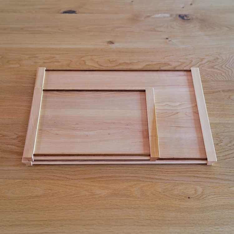 アサダなどのカバ材を使用したシンプルなデザインのトレー。サイズは大・小の2種をご用意しました。用途に合わせたてお選び頂けます。小はホッと一息つきたい時にコーヒーなどの飲み物とお菓子を添えたり、大は食卓上で一人分の食事を載せる「お膳」や、持ち運びの「お盆」に使ったり。金具を使わない「追い入れ」で仕上げ、持ち手の持ちやすさや立ち上がりの高さ、ちょうど良いサイズ感など、細かな使い心地にもこだわった商品です。