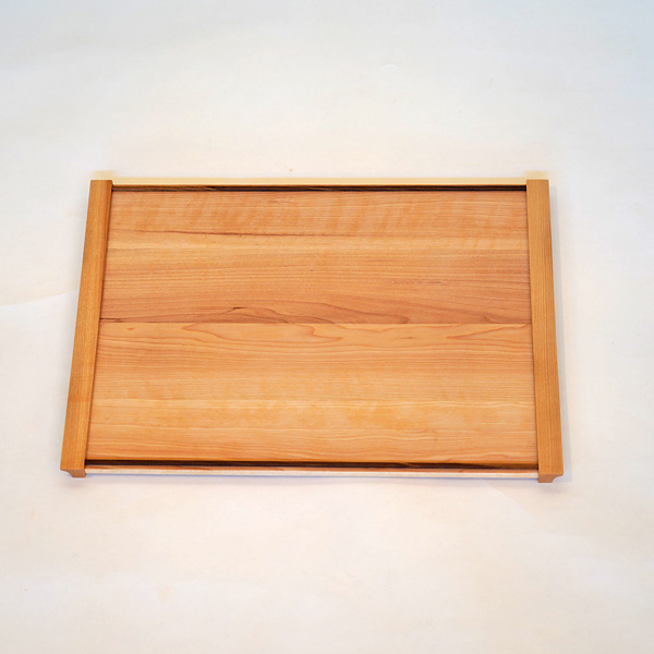 本体にはアサダなどのカバ科の材を使用しています。カバ科特有の滑らかな手触りは使用するたびに木の心地よさを感じさせます。また、ほんのりピンクがかかった色合いは食卓に温かな雰囲気をもたらします。お膳の長辺にはアクセントとして赤みを帯びた褐色のエンジュを使用。材の色合いの違いもお楽しみください。